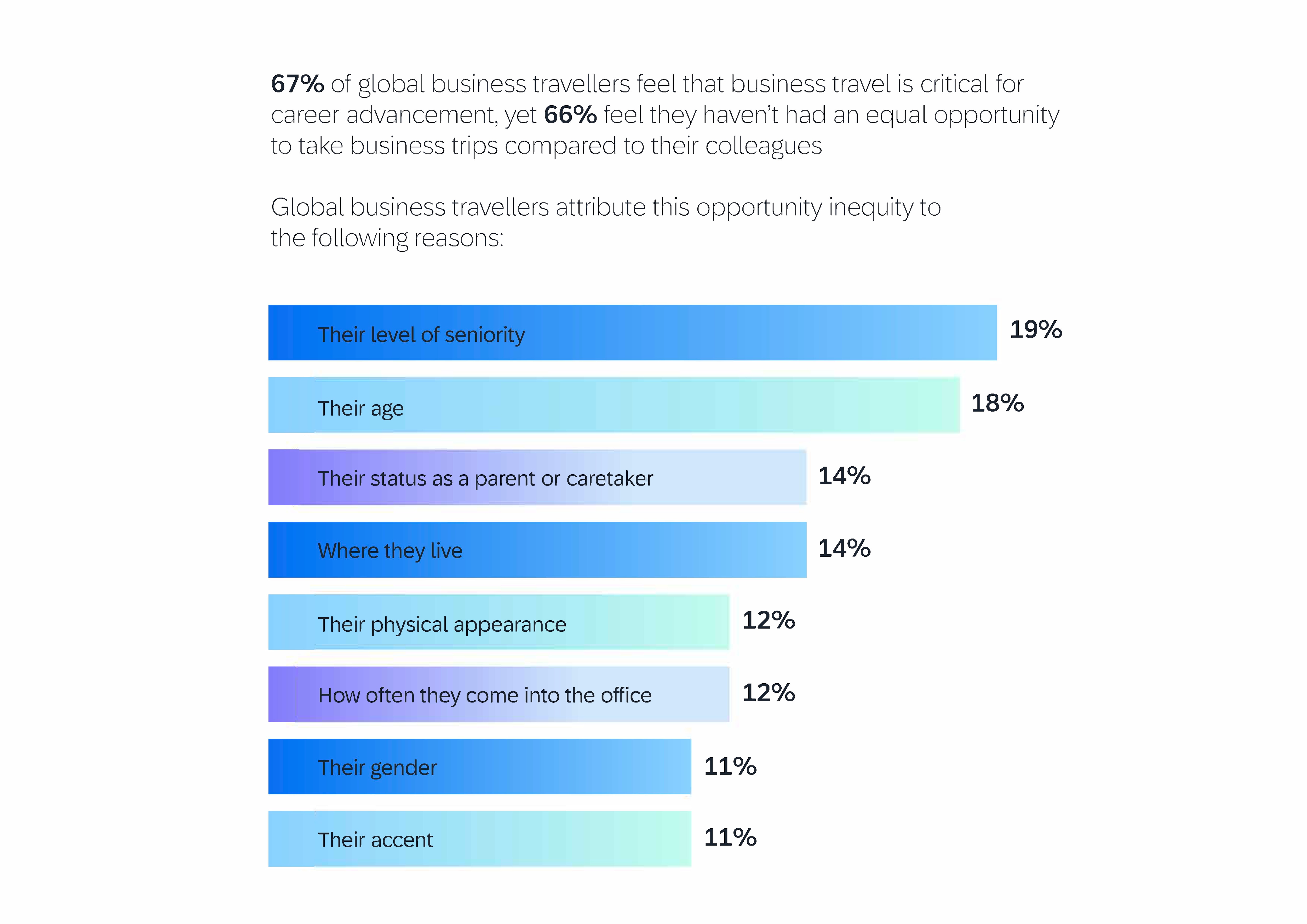 - Global business travellers attribute this opportunity inequity to the following reasons:
