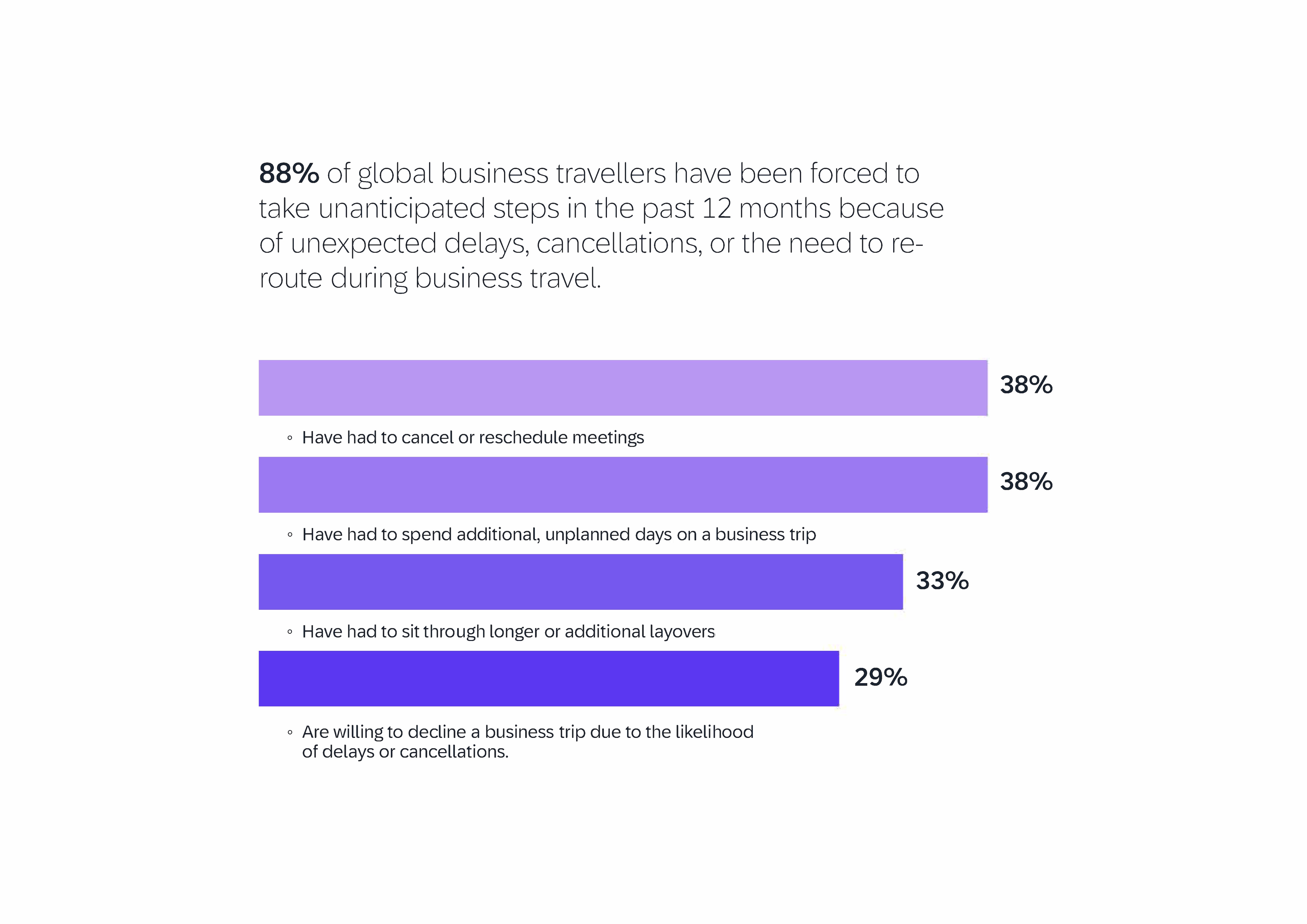 - The majority of global business travellers have been significantly impacted by travel disruptions in the past year. Nearly nine in 10 (88%) have been forced to take unanticipated steps in the past 12 months because of unexpected delays, cancellations, or the need to re-route during business travel.